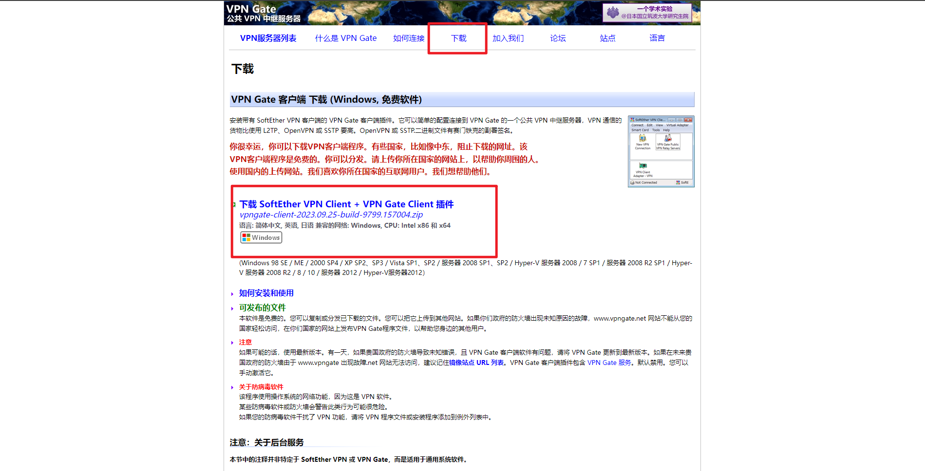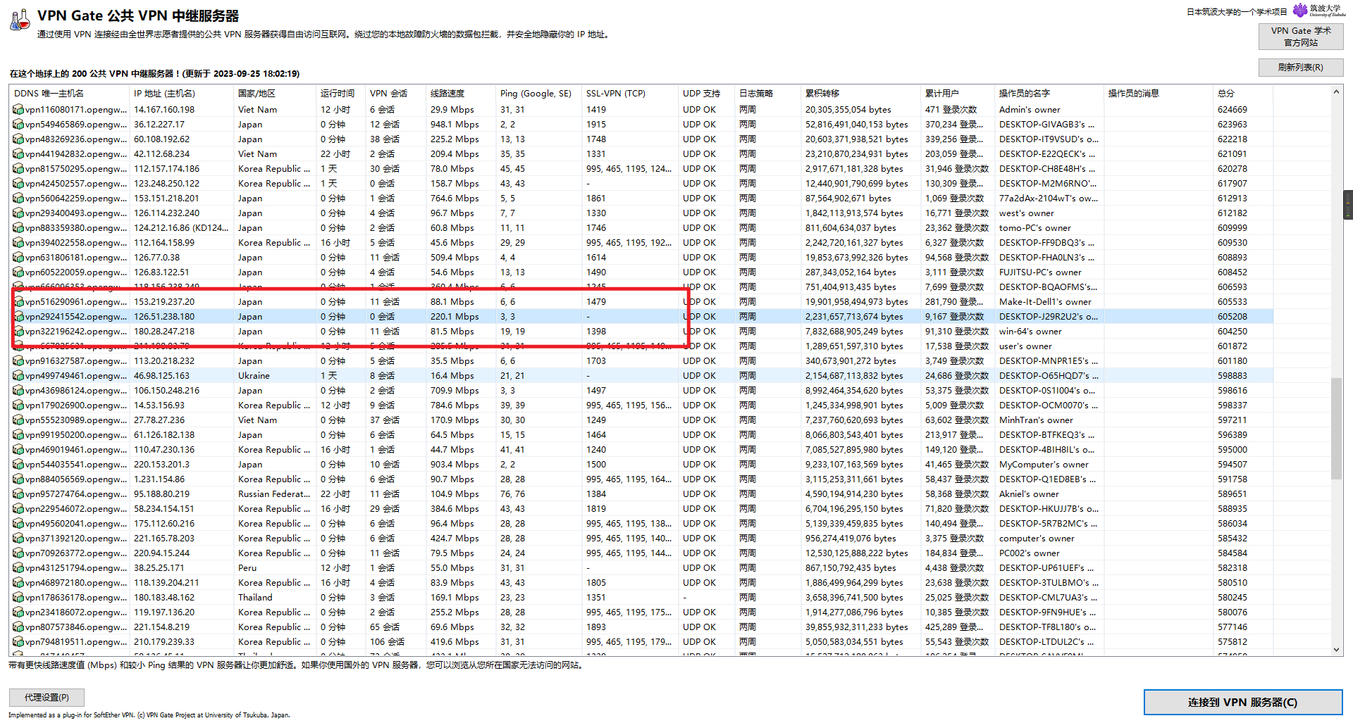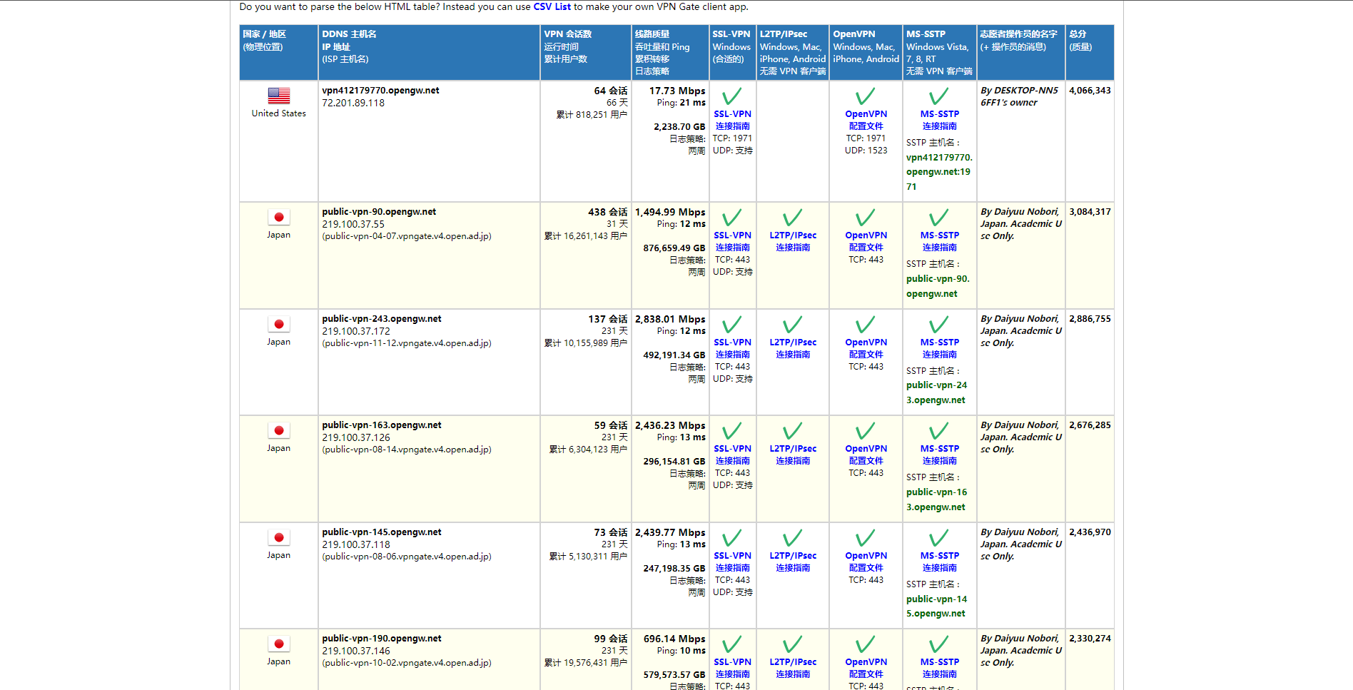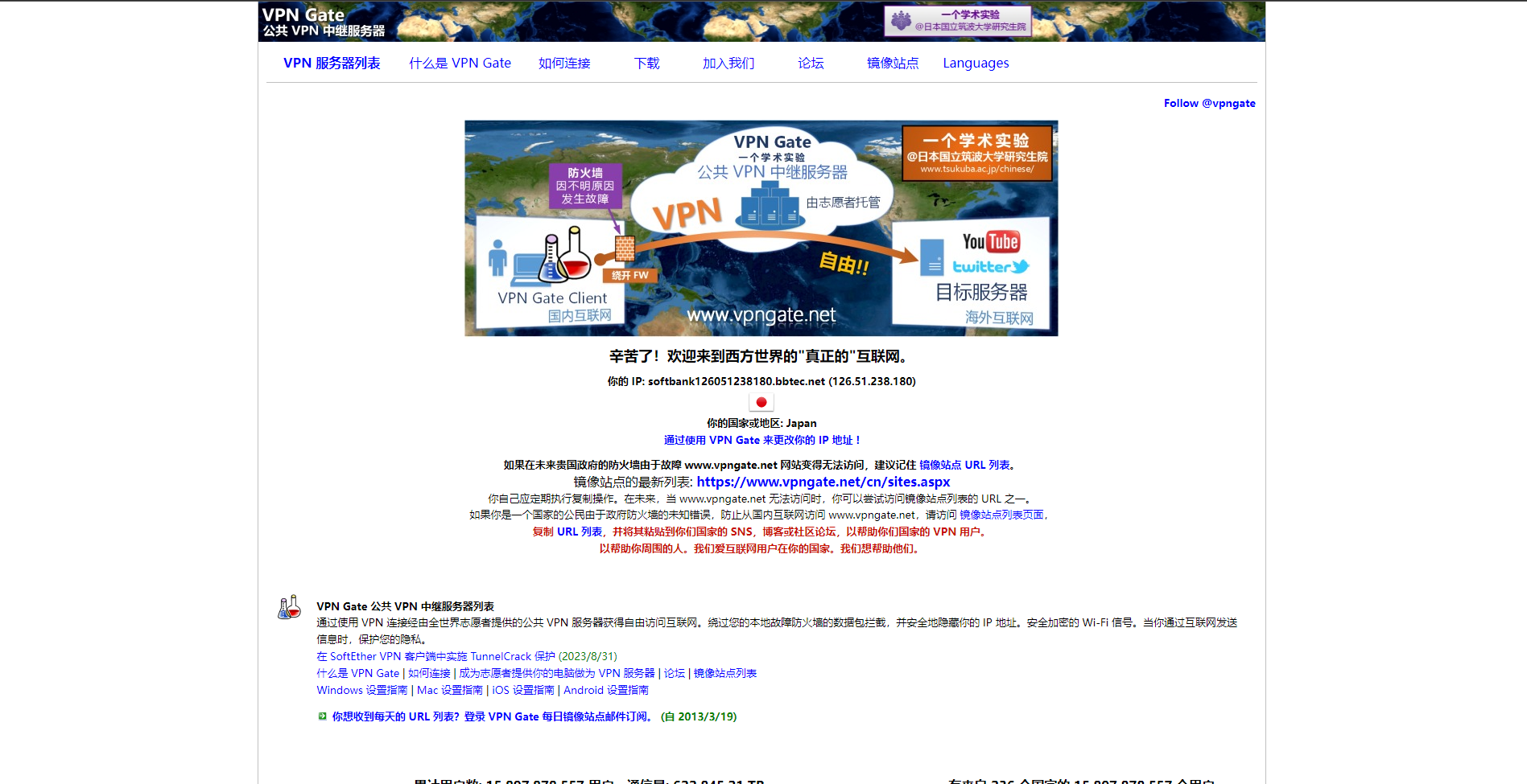 在之前博客当中分享过如何注册免费Warp账户,随着warp的爆火也吸引了一批白嫖党。随着使用者增多,warp逐渐变慢了。今天给大家介绍一个代理客户端并且内置各种电脑协议的代理。VPN Gate Client,VPN Gate 学术实验项目是一个在线服务,由日本国立筑波大学研究生院为学术研究目的运营。本研究的目的是推广 “全球分布式公共 VPN 中继服务器” 的知识。在 VPN Gate 学术项目网站上有一个公共 VPN 中继服务器列表。互联网上的任何人都可以建立 VPN 连接至任一列表上的 VPN 服务器。无需用户注册。