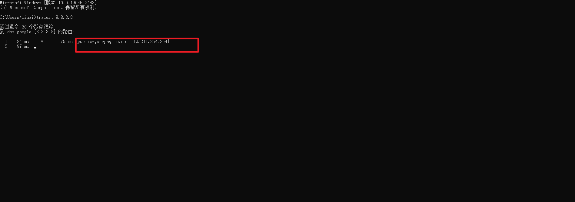 8.当 VPN 建立时,所有到互联网的通讯将通过 VPN 服务器转发。您可以在 Windows 命令提示中使用 “tracert 8.8.8.8” 命令验证。如果数据包路径是通过 “10.211.254.254” ,你的通信现在就是通过 VPN Gate 公共 VPN 服务器中的一个转发的。